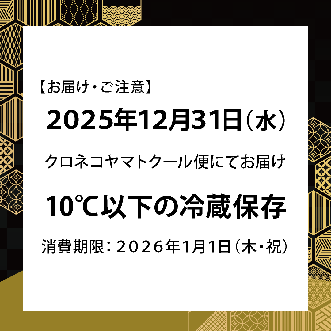 おせち重はクロネコヤマトクール便にて12月31日(水)着でお届けいたします。複数個ご注文の際は、配達状況により商品が個別に届く場合がございます。